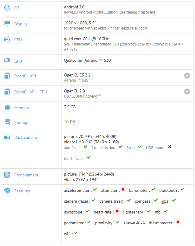 Итак, как и в прошлый раз, сведениями об Alcatel Idol 4 Pro поделился, если можно так выразиться, сайт бенчмарка GFXBench. Вот данные: