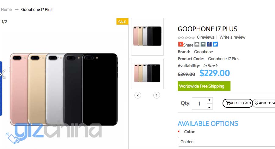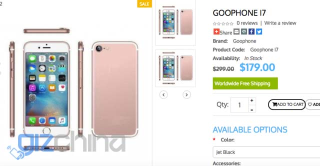 Помимо модели i7 Plus, компания GooPhone предлагает и обычный i7 - с 4.7" экраном, одной 12МП тыловой камерой, батареей на 1960 мАч. За старшую модель китайцы просят 229 долларов США, за младшую - $179. Доступные цвета: розовое золото, чёрный (2 варианта, как и у Apple), золотистый и серебристый.