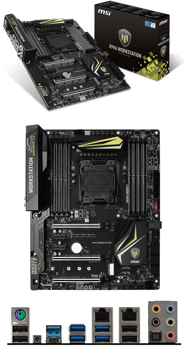 Решение для процессоров LGA2011-3 от MSI получило имя X99A WORKSTATION, устройство основано на чипсете Intel X99, обладает восемью слотами для оперативной памяти DDR4 (до 3333МГц), установить которой можно 128ГБ максимум, работать память будет в четырёхканальном режиме, поддерживаются ECC RDIMM модули, не обошлось и без Intel XMP.