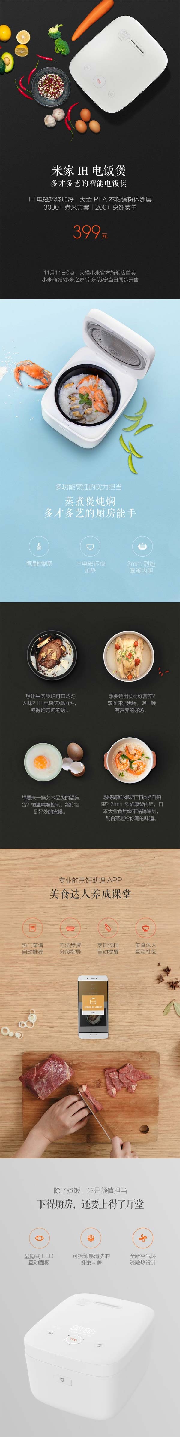 Уже совсем скоро компания Xiaomi выпустит под своим брендом Mijia новое устройство для готовки различных продуктов, главным образом - риса. Аппарат называется Mi IH Rice Cooker и внешне похож на мультиварку, обладает информационным LED дисплеем, на который выводятся полезные данные.