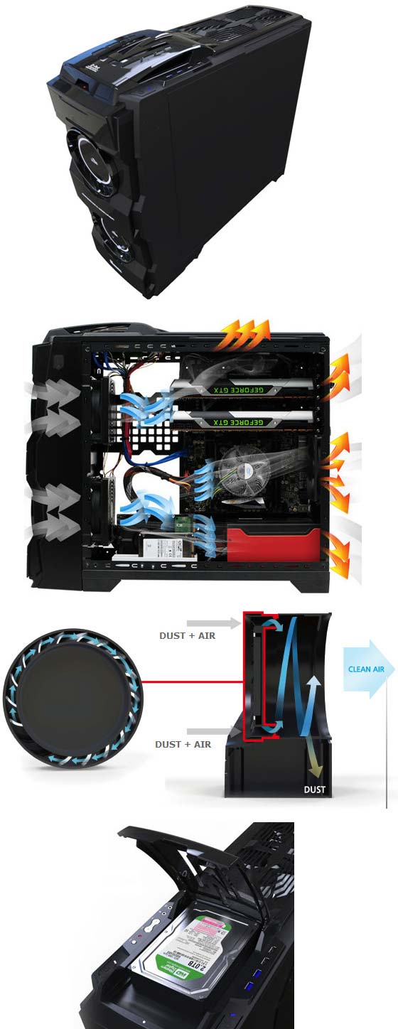 Название новинки - AXIOM Pro, этот компьютерный корпус сделан из АБС-пластика и стали, также в его конструкции применена резина, аппаратом поддерживаются системные платы форм-факторов ATX & microATX, а также ATX блоки питания. В новинке реализован всего один отсек для 5.25" устройств, четыре места для 3.5" накопителей и восемь мест для 2.5", также в шасси можно найти нечто вроде док-станции для 2.5/3.5" винчестеров.