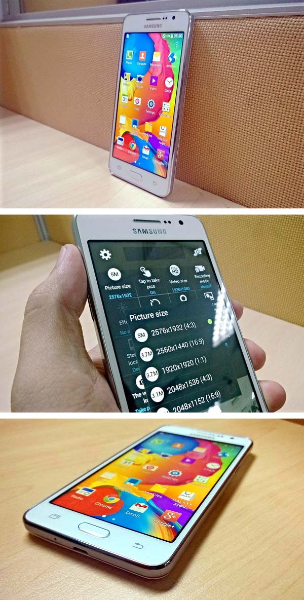 Размеры аппарата составляют 144.8×72.1×8.6мм, весит Galaxy Grand Prime 156 граммов. Смартфон поддерживает 3G HSPA+21Мб/с, 802.11 b/g/n WiFi, Bluetooth 4.0, GPS и ГЛОНАСС. Основой изделия стала 1.2ГГц четырёхъядерная SoC Snapdragon 400.