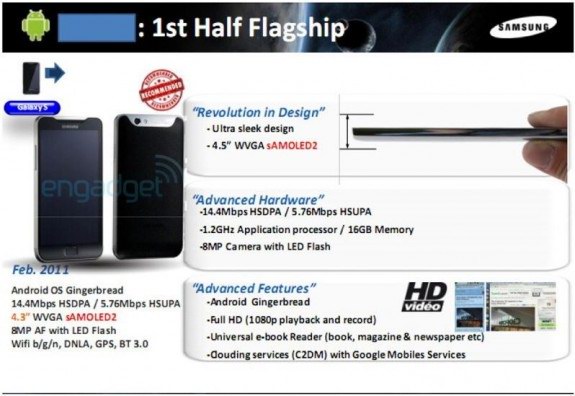 Только-только появился на свет Galaxy S, как Samsung, в надежде добыть ещё больше денег с наивных людишек (наверное так боссы гигантов индустрии именуют покупателей), объявляет о не столь далёком релизе нового смартфона, оборудованного сенсорным WVGA sAMOLED2 дисплеем с диагональю 4.5" и работающего под управлением Android 2.3 (Gingerbread).