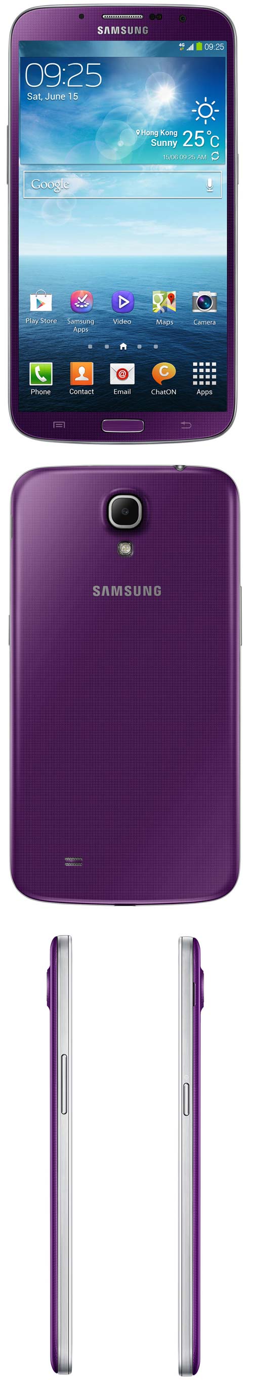 Сообщается, что пурпурный вариант Galaxy Mega 6.3 работает до 26.5 часов в режиме разговора в 2G и до 17 часов в 3G, время ожидания в 2G равно 675.5 часам, в 3G - 420 часам, а в 4G - 390 часам. Ценник аппарат неизвестен, по крайней мере на сайте Samsung его нет.