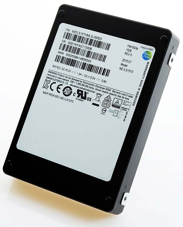 В накопителе PM1633a используется 512 чипов V-NAND флеш памяти 3-го поколения от Samsung по 256Гб каждый, всё это хозяйство уложено в 16 слоёв. Скорость последовательного чтения и записи составляет до 1200МБ/с, показатель IOPS на случайное чтение мелкими блоками - до 200000, на запись - 32000, последние показатели в 1000 раз превосходят то, на что способны SAS винчестеры. Решения также надёжны - показатель (drive writes per day) равен 15.36 терабайтам, полной ёмкости накопителя. Новинка проживёт от 2 до 10 раз дольше чем типичные SATA SSD с MLC или же TLC флеш памятью.