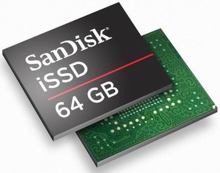 SanDisk в скором времени покажет iSSD (интегрированный твердотельный накопитель), небольшой чип размером 16x20x1.85мм и весом около грамма. Обещают даже для такой крохи организовать SATA-подключение, на мой взгляд это нечто лишнее. Малютка имеет ёмкость от 4 до 64 гигабайт и скорость передачи данных 160 мегабайт в секунду на чтение и 100 на запись, вполне прилично, жаль нам не сказали как у него дела с IOPS.