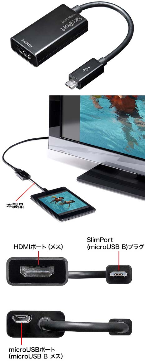 SlimPort вообще мало где используется, судя по всему, поэтому Sanwa предлагает свой переходник AD-HD14SP, который позволит через SlimPort пользоваться функционалом HDMI и microUSB. Т.е. к тому же Nexus 7 (новой модели 2013 года, LTE вариант которого со вчерашнего дня доступен девяти странам для приобретения через Google Play), можно подрубить USB накопитель или же вывести изображение с планшета на любой телевизор, проектор или же монитор, оснащённый видеовходом HDMI.