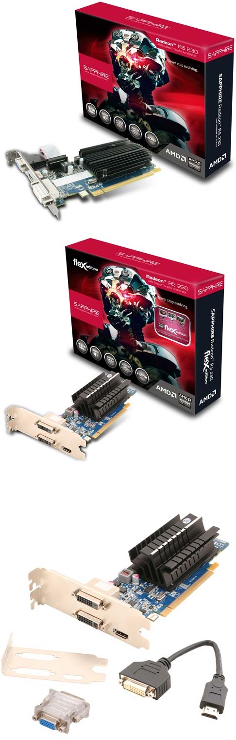 Трио аппаратов имеет пассивное охлаждение, что стало доброй традицией среди видеокарт Radeon R5 230. Две карточки мало чем выделяются из толпы аналогов от конкурентов, они обладают 1ГБ или же 2ГБ DDR3 памяти, ядра их работают на частоте 625МГц, а память на частоте 1334МГц, ширина её шины - 64-бита, имеющиеся видеовыходы: HDMI, DVI и D-Sub.