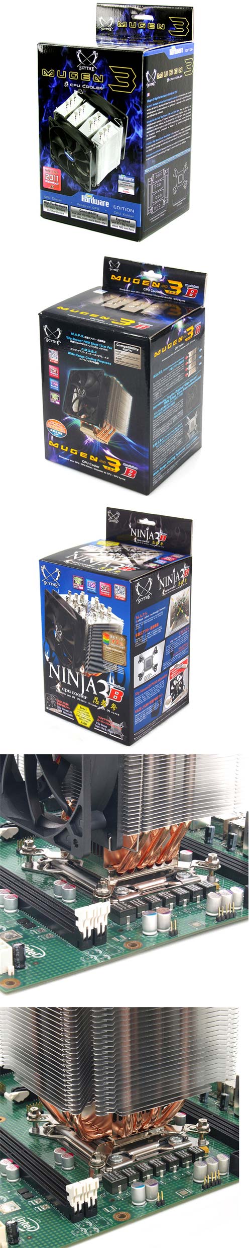 Итак, "обычные" версии Mugen 3, Mugen 3 PCGH и Ninja 3 теперь производиться не будут, а на рынок пойдут Rev.B варианты этих кулеров, отличающиеся от оригиналов лишь наличием в комплекте крепления для установки этих систем охлаждения на процессоры Sandy Bridge-E. Прочие крепёжные аксессуары останутся как есть, т.е. совместимость с LGA 775/1156/1155/1366 и решениями AMD никуда не делась.