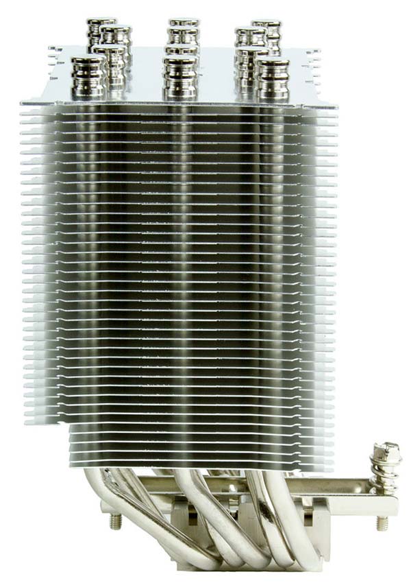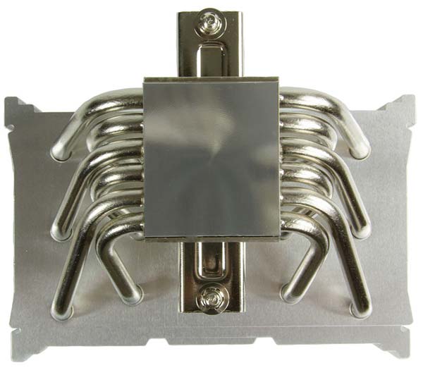 Размеры устройства составляют 130x154.5x110мм, вес равен 890 граммам. Основание радиатора сделано из никелированной меди, тоже относится и к теплотрубкам, коих в наличии 6 штук, пластины радиатора сделаны из алюминия, как это и бывает в большинстве случаев.