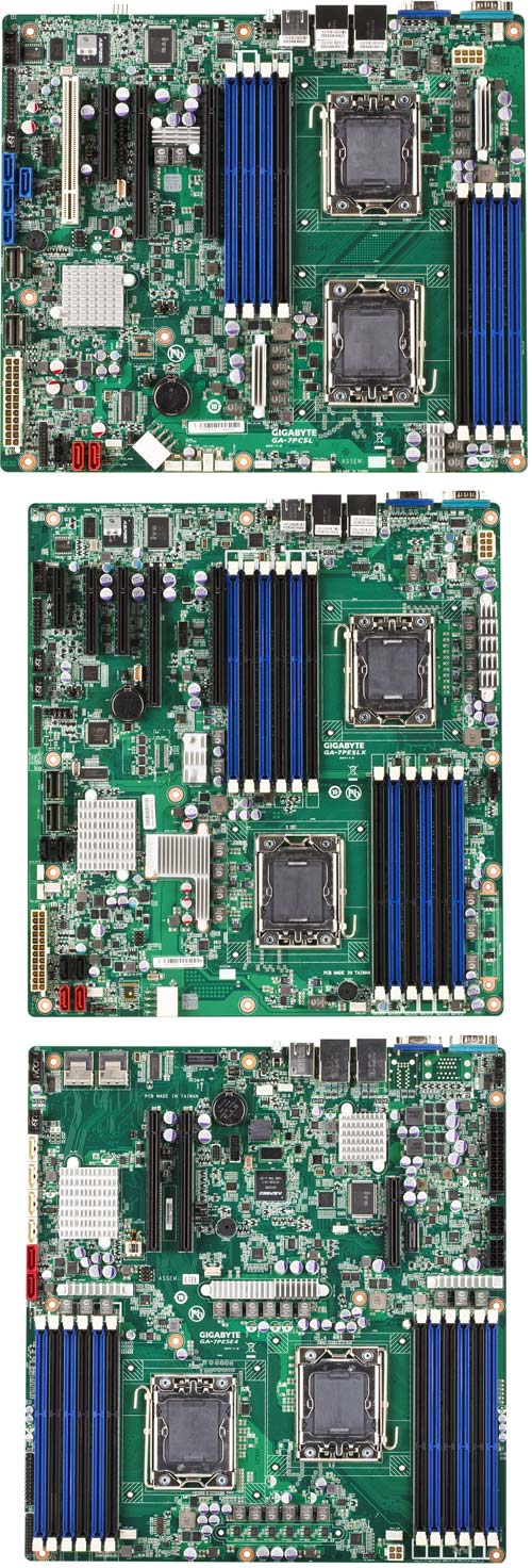 Итак, представлено аж пять системных плат для процессоров Xeon E5-2400, каждая из которых обладает двумя сокетами для названных CPU и 8-12 слотами для оперативной памяти DDR3 DIMM. Базируются устройства на Intel C602, имеют по 2-4 гигабитных сетевых порта, SATA 3Гб/с и 6Гб/с порты, и 2 x PCIe 3.0 х16 (от 1 до 2) и много чего ещё, хотя по большому счёту они похожи одна на другую по списку "фич". На деле перечислить спецификации пяти системных плат в одном материале сложно, потому я предлагаю почитать их на сайте Gigabyte, благо понять там написанное не составит труда. Тут главное не промахнуться, новинки это GA-7PESL & GA-7PESLX, GA-7PESE3 & GA-7PESE4 и GA-7PCSL.