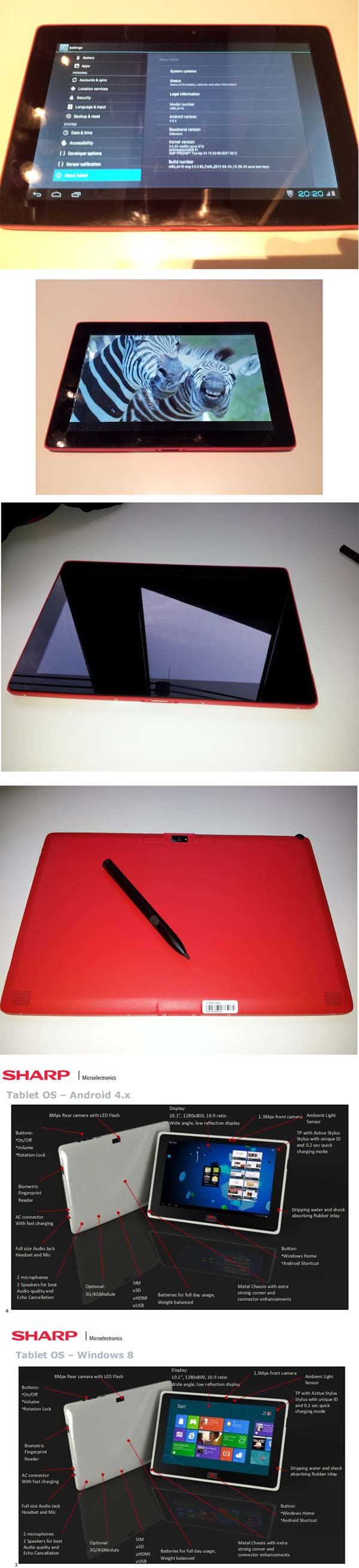 С Google+ стали доступны фотографии и некоторые подробности о прототипе планшета от Sharp, созданного чтобы нести в умы людей свет знаний. У девайса 10.1" экран, разрешение которого составляет 1280х800 пикселей, 1.3МП камера в фронтальной части и 8МП камера с обратной стороны. В списке интересных особенностей девайса названо наличие биометрического сенсора и возможность беспроводной зарядки. Ввод осуществляется с помощью стилуса/ручки/называйте эту штуку как угодно, экран новинки обладает мультитач (6 точек, 256 степеней давления, точность 0.4мм) возможностями.