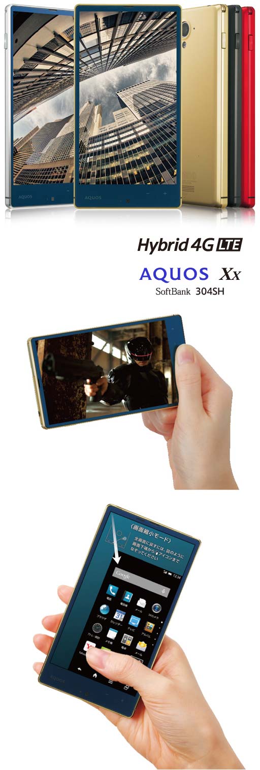 Планшетофон AQUOS Xx 304SH имеет 5.2" IGZO экран с Full HD разрешением, выпущен для оператора SoftBank, работает в сетях WCDMA и FDD-LTE, управляется Android 4.4. Размеры устройства составляют 72x135x9мм, весит оно 137 граммов.