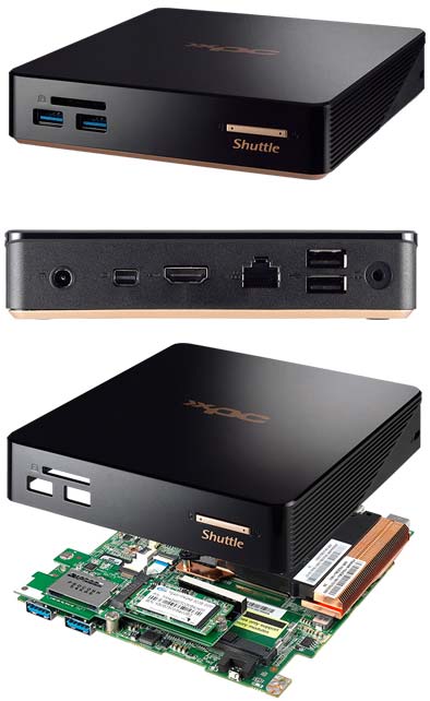 Устройство именуется NC01U, доступно несколько моделей, различающихся лишь процессорами (Celeron 3205U, i3-5005U, i5-5200U и i7-5500U). Форм-фактор аппарата - Shuttle 0.57L, в изделии имеется два слота для оперативной памяти DDR3L SO-DIMM, установить которой можно до 16ГБ (1333/1600МГц).