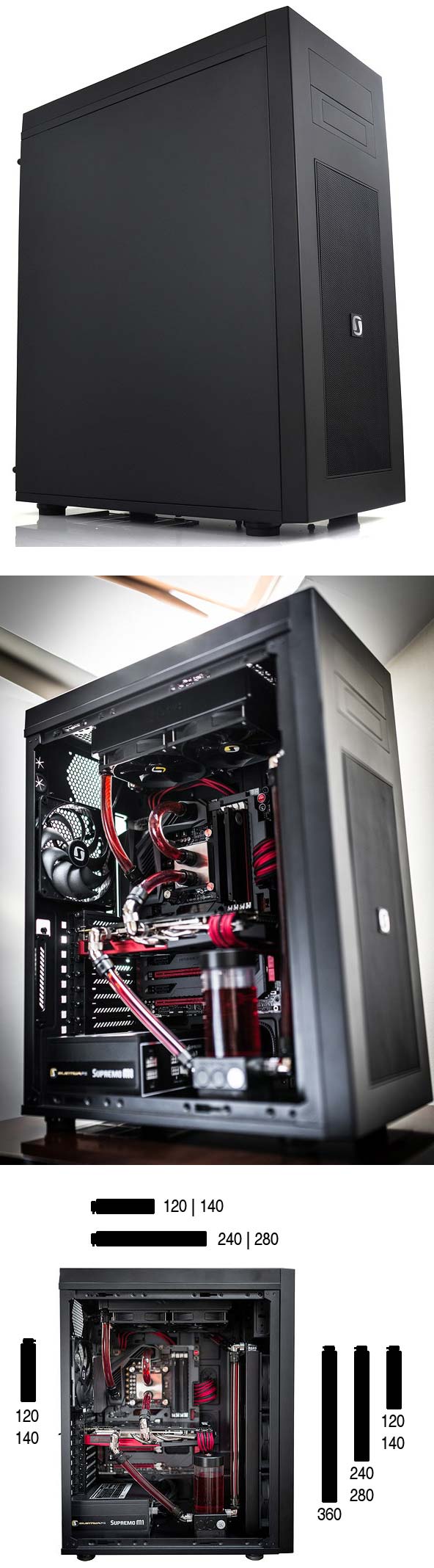 Шасси называется Aquarius X90 Pure Black (SPC098), сконструировано оно таким образом, что в него помещаются сразу три радиатора: 360мм, 280/240мм и 120мм (на фронтальную стенку, верхнюю и заднюю). Место для резервуара также имеется, на фото ниже можно посмотреть, куда что ставить.