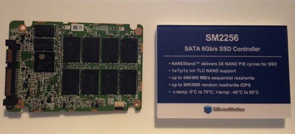 Изделие получило имя SM2256, данное решение предназначено для подключаемых по SATA 6Гб/с твердотельных накопителей, заявлено о поддержке 128Гб TLC NAND флеш памяти от Micron, изготовленной по нормам 16нм тех.процесса. SSD с такой памятью и контроллером способен показать до 540МБ/с на чтение и до 460МБ/с на запись данных, показатель IOPS на чтение - 90000 (QD32), на запись - 80000 (QD32).