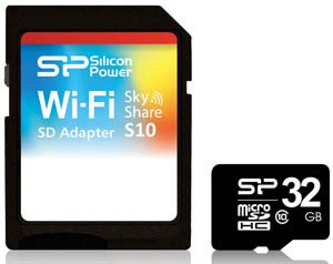 Новинка именуется Sky Share S10 и представляет собой SD адаптер/переходник с поддержкой WiFi. С его помощью, а также с помощью приложения Sky Share SD можно соединяться со смартфонами и планшетами (Android и iOS), а также с ПК и раздавать свои фото и, вероятно, видео. В комплекте с SD WiFi адаптером идёт карточка microSDHC на 16 или же 32ГБ, имеющая скоростной индекс Class 10.