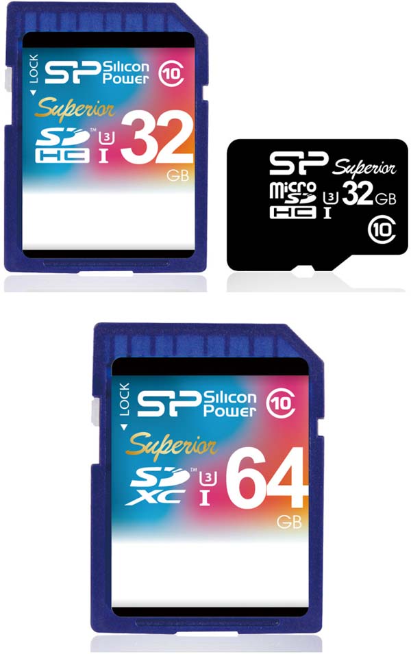 На SDXC карточку помещается до 180 минут видео в разрешении 4K при 15 кадрах в секунду, на SDHC и microSDHC влезает вдвое меньше контента. Размеры SDHC/SDXC карточек составляют 24x32x2.1мм, рабочие температуры - от нуля до 70° по Цельсию, а габариты microSDHC карточек Superior UHS-1 (U3) равны 15x11x1мм, а прочее не отличается от более крупных сородичей. Silicon Power предлагает 16 и 32ГБ карточки SDHC и microSDHC, а также 64ГБ SDXC.