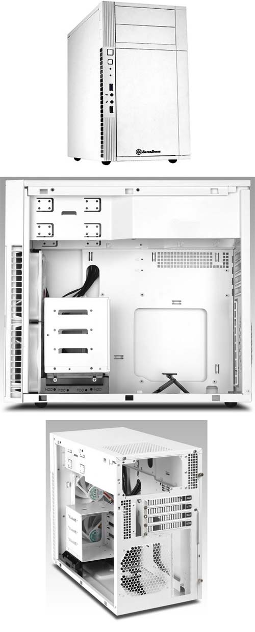 Кроме того, что у корпуса появились белые интерьер и экстерьер, ничего нового мы тут не увидим. Габариты шасси составляют 120х374х400мм, весит оно 5200 граммов, рассчитано на системные платы форм-факторов MicroATX, mini-DTX и mini-ITX. У корпуса два 5.25" отсека, один 2.5" отсек и пять мест для 3.5" накопителей, съёмный лоток для системной платы и такая же верхняя панель (хотя по фото и не скажешь).