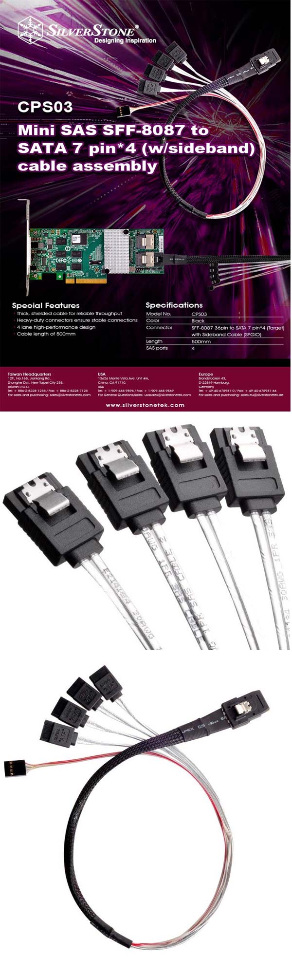 Впрочем, вряд ли кто-то будет удивляться предлагаемому ею кабелю SST-CPS03, который даёт возможность подключить к одному SAS порту (SFF-8087, 36-штырьковый) четыре SAS (7-пин) устройства. Решение обещает высокую пропускную способность, имеет коннектор SPGIO. Длина кабеля равна 500 миллиметрам, создан аксессуар из качественных компонентов, рассчитан на использование с Mini-SAS устройствами.