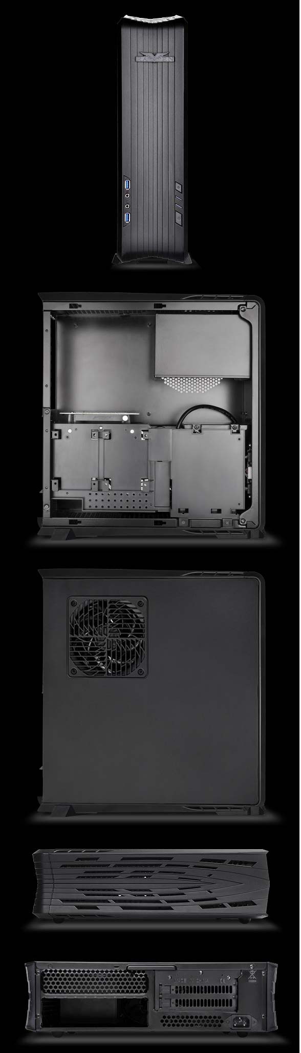 На панели ввода/вывода, находится которая в фронтальной части шасси, можно найти два порта USB 3.0, вход для микрофона и выход на наушники. Система охлаждения корпуса состоит из одного 120мм вентилятора (1500 об/мин, 18 дБ) на верхней стенке и одного такого же в днище, плюс там же есть место для дополнительного "карлсона".