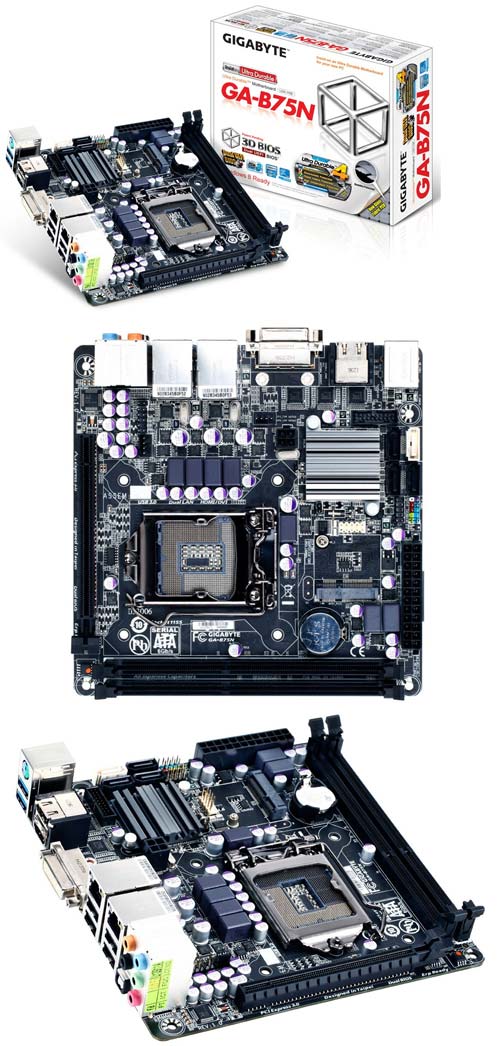 Новинка именуется GA-B75N, это изделие основано на чипсете Intel B75 Express. Сама плата работает с процессорами Core второго и третьего поколений и прочими "камушками", что имеют сокет LGA1155. Изделие подойдёт для создания HTPC или чего-то иного компактного, т.к. форм-фактор GA-B75N - mini-ITX.