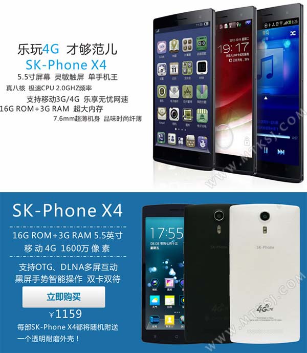 Китайские аппараты и так стоят в большинстве своём значительно дешевле аналогов от так называемых брендов, однако продукт SK-Phone слишком крут для своей стоимости. Изделие обладает 5.5" Full HD экраном, 2ГГц восьмиядерной SoC MT6592, тремя гигабайтами оперативной памяти и 16ГБ расширяемой флеш памяти.