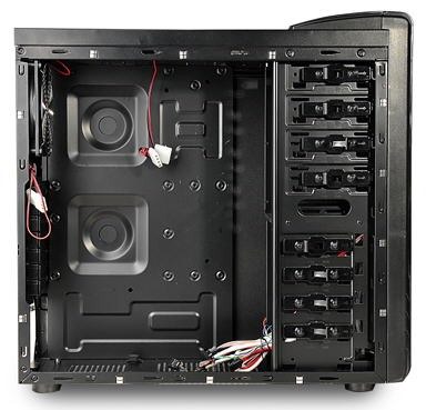 Новинка рассчитана на геймеров, как и большинство выпускаемых корпусов таких габаритов. Кстати о последних, они составляют 480х191х450мм. Вес железяки - 6.2КГ. У шасси имеются четыре 5.25" отсека, некое подобие окна на боковой стенке и выведенные на переднюю панель USB и аудио порты. Видеокарты (максимальная длина видяхи, которую корпус может принять, не указана) и накопители устанавливаются без помощи каких-либо инструментов (tools free-режим). Для владельцев систем жидкостного охлаждения предусмотрены отверстия под шланги (два) на задней стенке шасси. Spire не поскупилась и установила четыре 120мм вентилятора в этот корпус - спереди (с голубой подсветкой), один - сзади и два - на верхней стенке. Скорость вращения лопастей не указана.