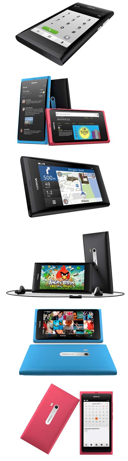 Аппарат поддерживает связь по GSM и WCDMA, может передавать данные по HSDPA 14.4Мб/с. Озвучена поддержка GPS, NFC, Bluetooth 2.1 и 802.11 b/g/n WiFi, имеется micro USB порт. Батарея смартфона имеет ёмкость 1450мАч, её должно хватить на довольно продолжительное время работы умного телефона. Некоторой неожиданностью стал выбор ОС для N9 - MeeGo. Я почему-то предполагал вновь (как и во многих других смартфонах Nokia) увидеть Symbian, в меньшей степени - Android. Смартфон будет доступен в чёрном, пурпурном (скорее даже алом) и голубом цветовых вариантах.