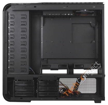 Габариты шасси: 224х642х657мм, вес - 17.4КГ, материал изготовления - алюминий. Материнская плата крепится под углом 90 градусов, что должно (а должно ли?) улучшить обдув компонентов. У корпуса имеется девять отсеков для 5.25 дюймовых устройств, этого количества должно хватить кому угодно, как мне кажется. На передней панели расположены входы для наушников и микрофона, а также USB 2.0 и USB 3.0 порты (по два каждого вида). Мест для установки 3.5" винчестеров - 6 штук, а для 2.5" накопителей - 3. В корпусе предустановлено пять вентиляторов - два 180мм Air Penetrator AP181, что имеют скорость вращения лопастей в 700/1200 оборотов в минуту, плюс к этому два 120мм AP121, имеющих постоянную скорость вращения крыльчатки в 1200 об/мин и один 120мм "карлсон" на крыше (его скорость - 900об/мин).