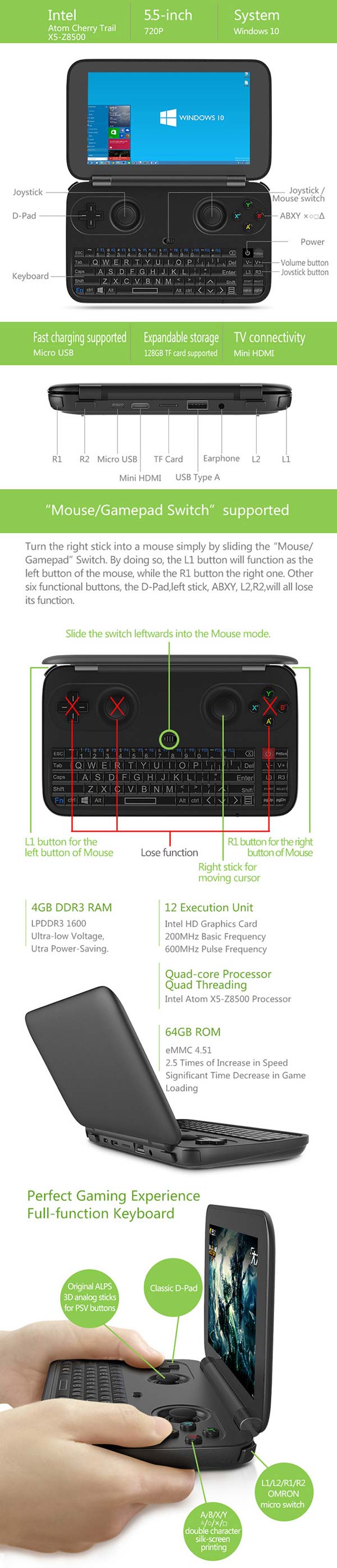 Решение похоже на смесь планшета и ноутбука с Nintendo 3DS, аппарат основан на процессоре Intel Atom X5-Z8500 (1.44~2.24ГГц), обладает 4ГБ оперативной памяти LPDDR3-1600, 64ГБ встроенной флеш памяти eMMC 4.51, может похвастаться 5.5" 720p Mutli-touch экраном защищённым Corning Gprilla Glass 3. Управление решением доверено Windows 10 Home.