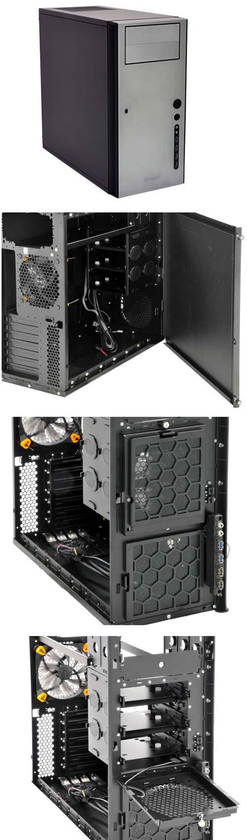 На передней панели новинки от Antec находятся два USB 3.0 и столько же USB 2.0 портов, плюс входы для наушников и микрофона. Установочные места для вентиляторов снабжены съёмными пылевыми фильтрами. Кстати о вентиляторах - на задней стенке корпуса предустановлен двухскоростной (видать есть переключатель) 120мм вентилятор TrueQuiet, судя по названию - очень тихий.