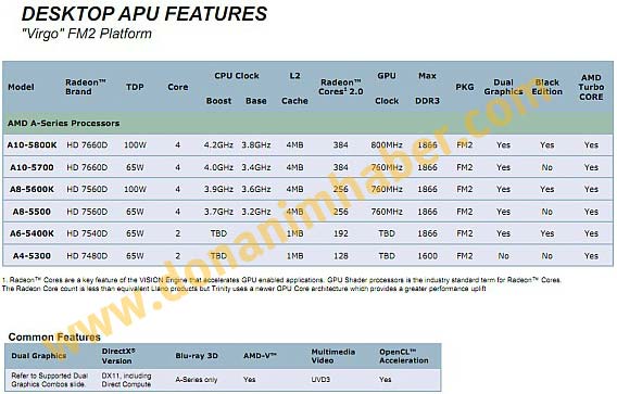 Обратите внимание, что на этот раз в линейке APU нет трёхъядерных решений - либо 2 ядра, либо 4. Мы можем наблюдать довольно впечатляющие спецификации, особенно с учётом того, что процессорные ядра описанных APU основаны на архитектуре Piledriver (должны быть на 15% шустрее того, что мы видели у "Бульдозеров"), а видео-решения - на Radeon HD 7000. Количество потоковых процессоров в Radeon HD 7660D, HD 7560D, HD 7540D и HD 7480D составляет 384, 256, 182 и 128, соответственно.