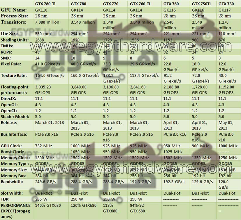Иностранный сайт Egypthardware.com опубликовал у себя табличку с внушительным списком видеокарт серии GeForce 700.