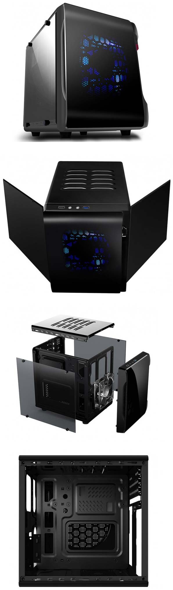 Шасси идёт в комплекте с блоком питания на 420 ватт, охлаждается который 120мм вентилятором. У БП 24-пиновый ATX кабель, 4-пиновый EPS, три SATA, один IDE и флоппи кабели. Количество слотов расширения равно двум, мест для 3.5" устройства три, на панели ввода/вывода находятся порты USB 3.0 и HD аудио. На боковой и верхней стенках предусмотрена возможность использования вентиляторов, с фронта 120мм вентилятор с подсветкой установлен производителем.