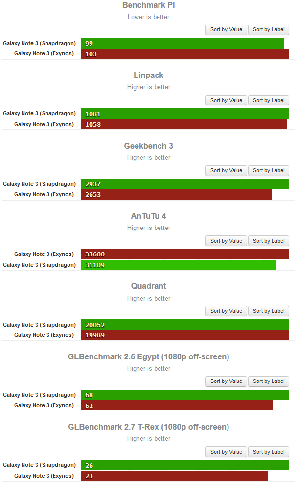 Планшетофон Galaxy Note 3 выпущен с Exynos 5420 Octa и Snapdragon 800 внутри, что же предпочтительнее для покупателя, какая SoC одержит победу в бенчмарках? Вот результаты некоторых (не всех) тестов: