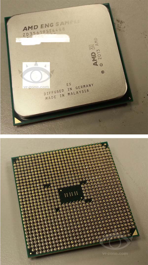 На фото ниже изображена инженерная версия одного из APU Kaveri, номер партии - ZD356195I4468, обратная сторона APU напоминает по распиновке APU Richland, но изменения, конечно же, есть. Расшифровка названия такова - D35 означает, что перед нами десктопный (для настольных систем, не мобильных) APU с тактовой частотой 3.5ГГц, по прочим данным становится ясно, что у него четыре ядра и 4МБ кеша второго уровня.