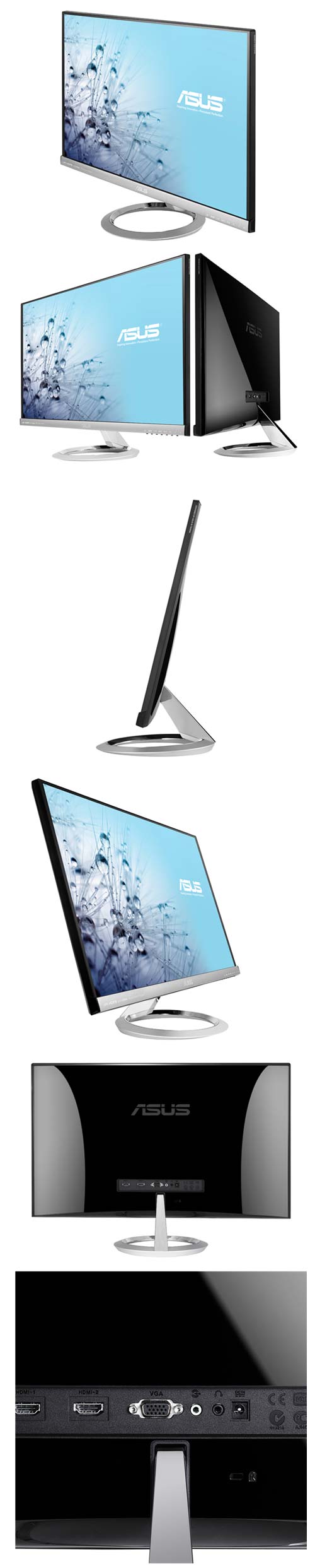 У монитора ASUS MX279H имеются следующие видеовходы: два HDMI, D-Sub/VGA, DVI-D (через переходник HDMI-на-DVI). В устройстве имеется 3.5мм "джек" для наушников. Монитор в обычном своём режиме потребляет около 37 ватт, в режиме сохранения энергии - 0.5 ватт. Цвет корпуса изделия ASUS - серебристый и чёрный, рамка вокруг экрана очень тонкая.