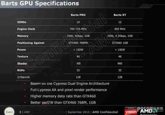 Barts будет доступен в двух вариантах: Barts XT и Pro. Первый обладает следующими характеристиками: 12 SIMD (SIMD, Single Instruction, Multiple Data — одиночный поток команд и множественный поток данных), 48 текстурных юнитов, 960 шейдерных, 32 ROP. Память будет 256-битной. Ядро работает на 850МГц, а 1ГБ GDDR5 памяти - на 4200МГц, уровень энергопотребления ~150 ватт.