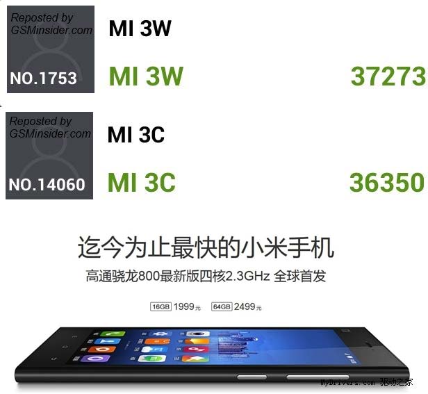 Изделие имеет в основе 2.3ГГц вариант указанной Soc и 2ГБ оперативной памяти. Результат теста впечатляющий - 37273 очка смог заработать WCDMA вариант аппарата, а CDMA показал результат в 36350 очков. В Китае новинка поступит в продаже по цене в 1999 юаней (~10908 рублей) за 16ГБ версию и 2499 юаней (~13637 рублей) за 64ГБ вариант Xiaomi Mi3 с SoC Snapdragon 800.