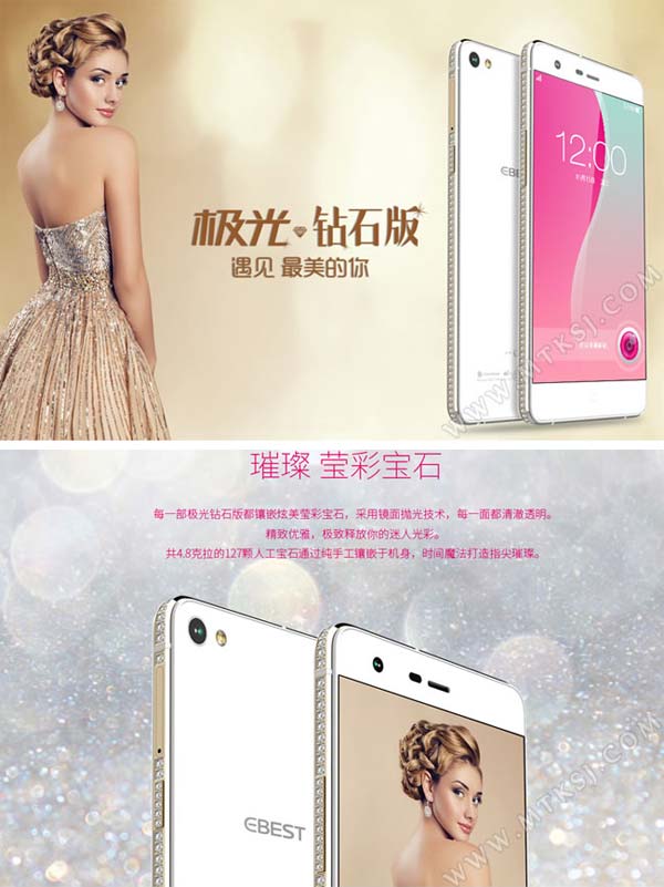 Аппарат именуется Ebest Aurora Diamond (иногда его именуют Diamont), он является планшетофоном с 5.2" экраном, разрешение которого составляет 1280x720. Дамам устройство должно понравиться из-за инкрустации камнями, напоминающими бриллианты, коих насчитывается ровно 127 штук, общий вес - 4.7 карата.