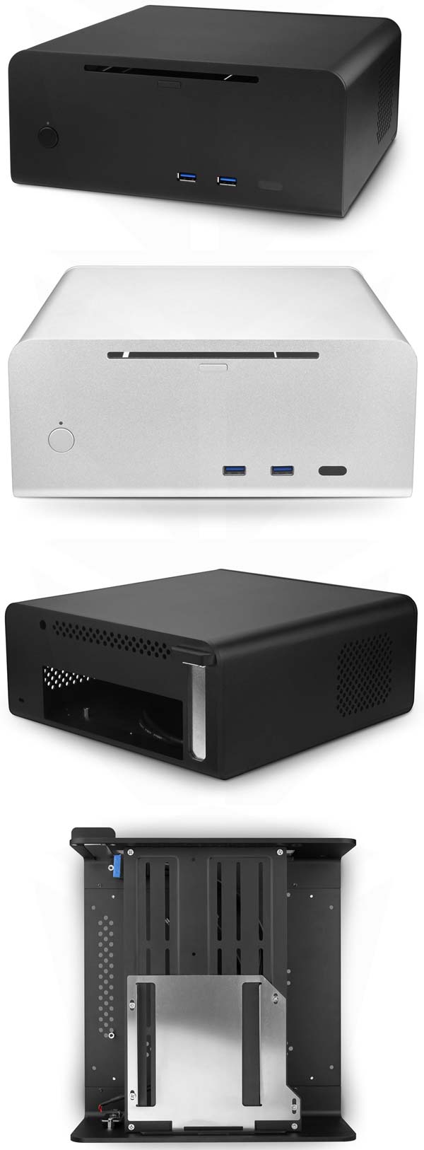 Как и предыдущее шасси, F7C Alpha сделан из качественного алюминия, панели имеют толщину 4мм, шасси весит 2.1КГ и совместимо с системными платами форм-фактора Mini-ITX. Есть вариант корпуса с отсеком для оптического привода, а есть и без оного. Внутрь аппарата влезут накопители в следующих конфигурациях: 2 x 2.5" + 2 x 3.5" или 5 x 2.5" или 3 x 2.5" + 1 x 3.5 или же 1 x оптический привод и 1 x 2.5" + 2 x 3.5" или 4 x 2.5" или 2 x 2.5" + 1 x 3.5".