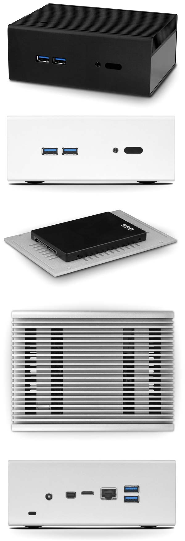 Аппарат называется NC2, его размеры составляют 150x112x59мм, вес - 850 граммов, материалы изготовления - алюминий и акрил, доступные цвета - чёрный и серебристый. Внутрь аппарата влезет материнская плата/платформа NUC, один 2.5" накопитель, плюс на системной плате будет mSATA SSD.