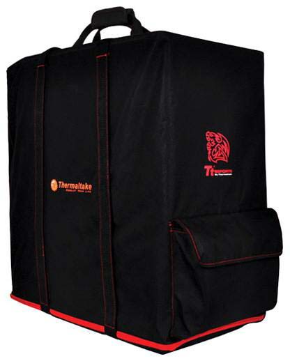 Сумка кличется Transporter, она сделана из прочного материала, способного выдержать длительное таскание ПК весом до 100кг. Я не представляю себе такой тяжёлый компьютер, но мало ли как народ извращается - может у кого-то корпус из чугуна с толщиной стенок в 2 сантиметра, кто знает? Как бы там ни было, если шасси Вашего ПК имеет габариты не более 600x300x600мм, то продукт от Tt eSPORTS должен подойти для его транспортировки.