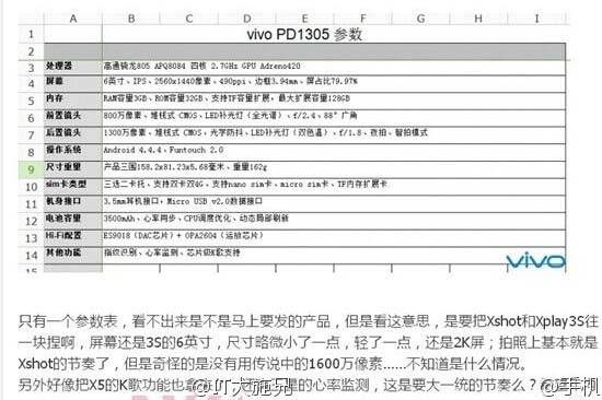 Аппарат пока что не получил маркетингового имени и довольствуется названием модели - PD1305. Агрегат обладает 6" IPS тачскрином с разрешением QHD, отношение дисплей-корпус составляет 79.95%, если кому-то это интересно. Основой фаблета стала 2.7ГГц четырёхъядерная SoC Qualcomm Snapdragon 805 с графикой Adreno 420, объём оперативной памяти равен аж трём гигабайтам, а места на накопителе имеется 32 гигабайта.