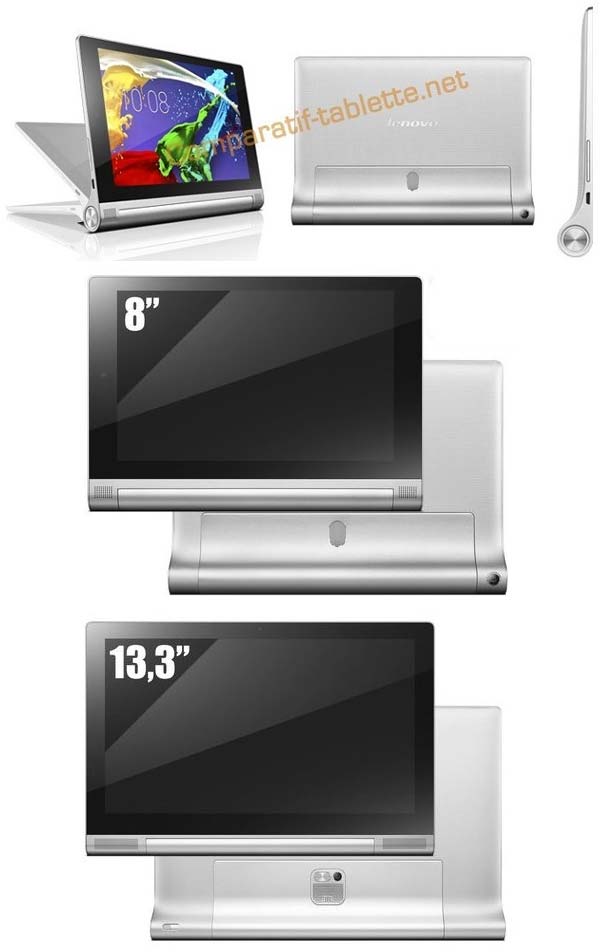 Первое изделие - Lenovo Yoga 2 8.0, этот аппарат с 8" Full HD (1920x1200) экраном имеет в основе четырёхъядерное решение Intel Bay Trail Z3745, объём оперативной памяти равен двум гигабайтам, места для файлов пользователя выделено 16ГБ. Управляется агрегат Android 4.4, весит 400 граммов, питается от батареи на 6400 мАч, имеет 8МП тыловую и 1.6МП фронтальную камеры. Поддержка WiFi и Bluetooth имеется, есть в наличии и видеовыход HDMI.