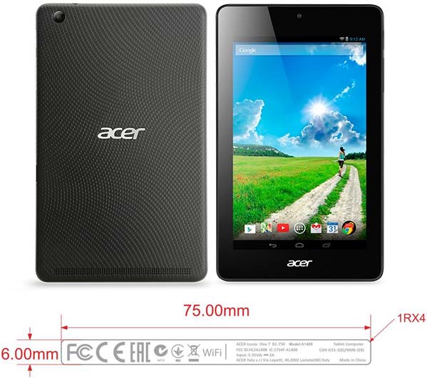 Устройство именуется Iconia One 7 (B1-750), это планшет с 7" IPS экраном, разрешение которого составляет 1280x800, он имеет две камеры - 5МП тыловую и 0.3МП фронтальную. В основе устройства лежит SoC Intel Atom Z3735G, имеющая четыре ядра, работающих на тактовой частоте 1.33~1.83ГГц.