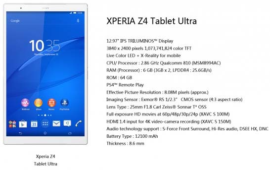 Новинка называется Xperia Tablet Z4 Ultra, она получит 12.97" IPS TRILUMINOS экран с разрешением 3840x2400, способным отображать более миллиарда цветов. Основой планшета станет многоядерная SoC Snapsdragon 810 (MSM8994AC) от Qualcomm, работающая на тактовой частоте 2.86ГГц.