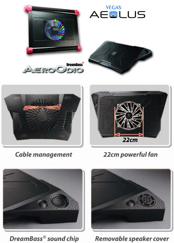 Первая именуется AEOLUS VEGAS (CP007) - это кулер для ноутбуков, созданный из алюминия, имеющий размеры 464x386x59мм и весящий целых 2.3КГ. Вентилятор внутри изделия установлен 180мм (Vegas с 4-цветной LED подсветкой), скорость вращения его лопастей составляет 900 ± 150 об/мин, шума от изделия - 18 децибел. Подключение к ноутбуку осуществляется по 500мм USB 2.0 кабелю, предназначен кулер для 17" ноутбуков.