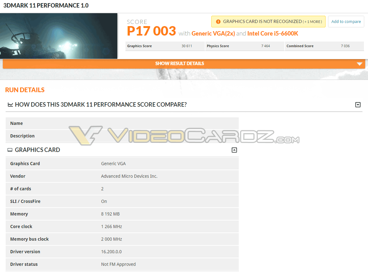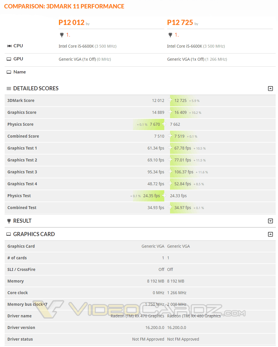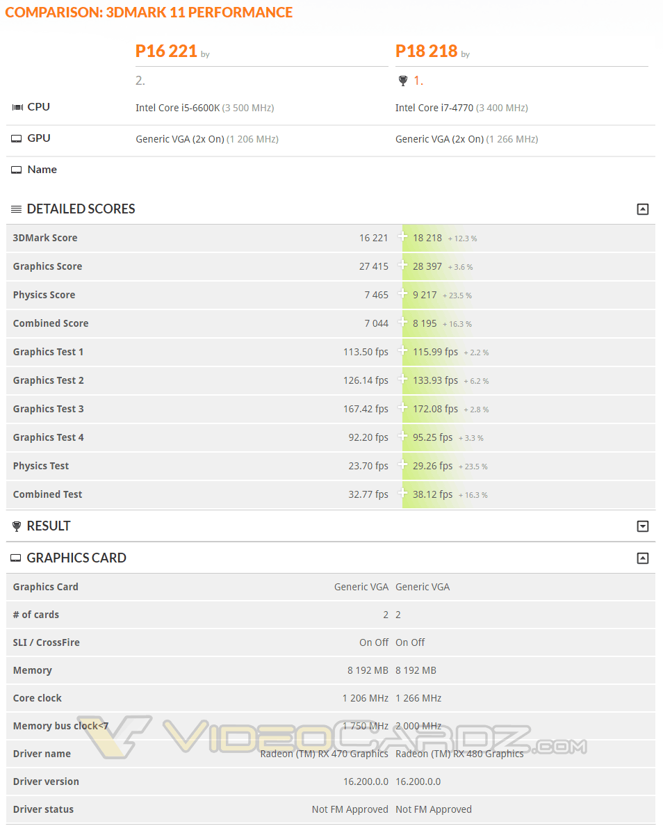 Средний результат RX 480 составляет 16823 очка, минимальный - 15520 очков, наивысший - 18060 очков. У RX 470 средний результат - 13368 очков, минимальный - 13100 очков, максимальный - 16164 очка. Отмечается, что два RX 480 в CrossFire обгоняют одну GeForce GTX 1080, набирая 30611 очков.